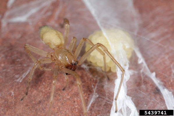 Spider eggs are laid in groups enclosed in a silken egg sac. The number of eggs can vary from as few as 10-20 or as many as 1000 or more. The form of the eggs sac is also variable and may be diagnostic for a species. This is a female Cheiracanthium inclusum with a seven day old egg sac.