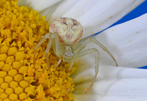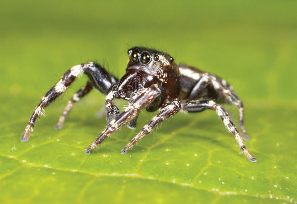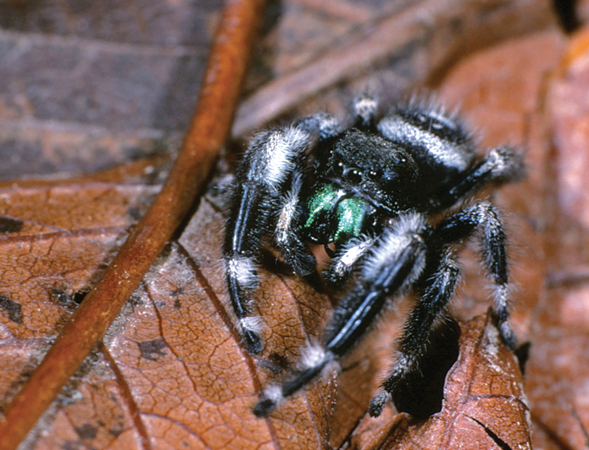 Although small (generally less than 8mm), jumping spiders look and act fierce. Many species are colorful and/or strikingly marked, especially the males, The Phidippus audax male shown here is such an example.