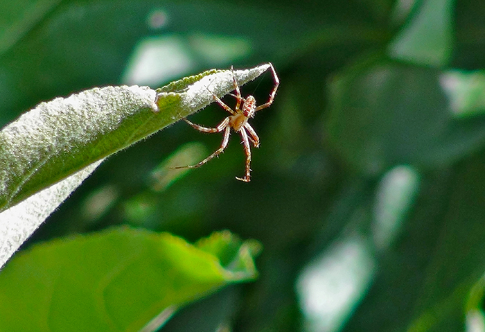 Though not the only spiders that spin webs, the Orb Weaver spiders are the group most likely responsible for the big webs you walk into while scouting your orchard. On this particular day, the orchard was scattered with their big webs stretching across the orchard rows. The occupant of this web is thought to be an Araneus sp.