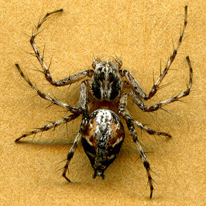 Spiders are often feared by the general public. But they do a lot of good in the orchards. Recent work done with our project has shown that spiders are voracious eaters of many pests including moth larvae such as codling moth. (See "Codling Moth: its what's for dinner") The 50 or more spider species that might be present in a moderately sized organic orchard can be divided into two large groups: web-makers (about 55%) and hunting spiders (about 45%). Web-makers construct large silken webs (the design is often characteristic of that species). Their prey fly or fall into the webs and are stuck until eaten. Although hunting spiders also produce silk, they don't build webs to catch their prey. Instead they use their legs and mouthparts to capture prey. Some hunting spiders actively pursue their prey, while others use a sit-and-wait prey capture strategy allowing the prey to come to them.
