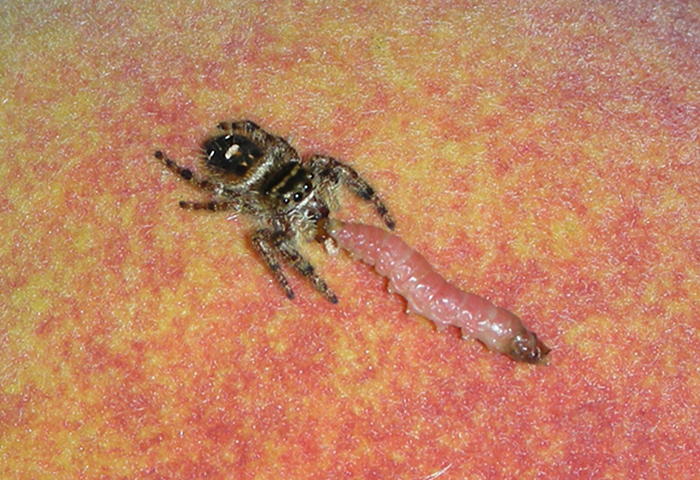 Did I mention jumping spiders were fierce predators? This young male Pelegrina sp. is taking on an Oriental Fruit Moth larva.