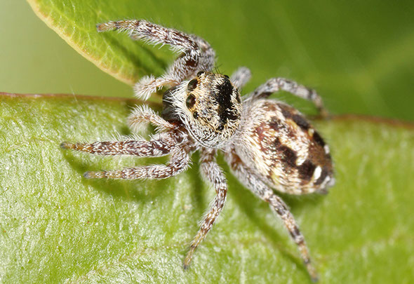 Female jumping spiders like this Phidippus comatus are less colorful than the males, but still have pronounced markings and the very large front-facing pair of eyes characteristic to this family of spiders. Jumping spiders actually have 4 pairs of eyes and are amongst those with the keenest eyesight in the spider world. They are known to stalk their prey and pounce from a distance of several body lengths, hence their name.