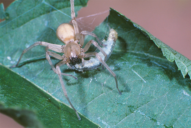 This is another Yellow Sac Spider, Cheiracanthium mildei, feeding on a pandemis leafroller larvae.