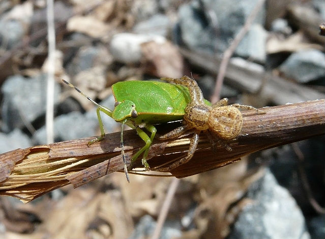 Because of the large powerful front legs crab spiders can attack prey much larger than they are. The Xysticus elegens shown here is attempting to capture a green stink bug thats over twice its size.