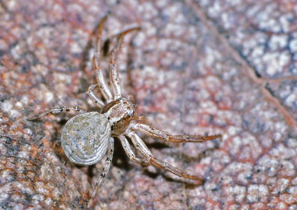 The Xysticus cuntator crab spider shown here on a dried leaf illustrates how well they can blend in with their surroundings. This allows them to use a sit-and-wait prey cature strategy. This species is also commonly found in orchards.