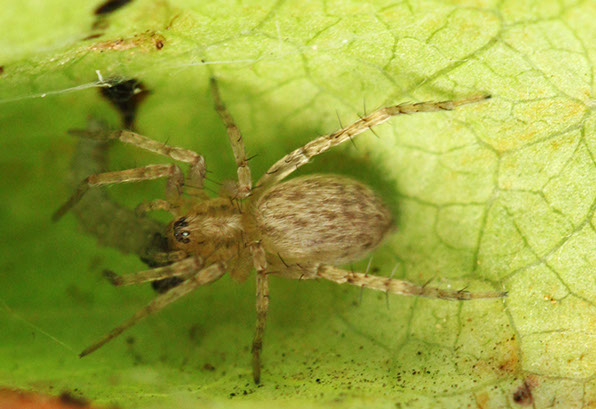 The Ghost spider Anyphaena pacifica often makes ts home in curled leaves. This lucky spider had unsuspecting leafroller larvae drop in for dinner.